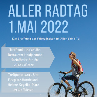 Der Aller-Radtag ist das große Fahrrad-Event für die ganze Familie im Aller-Leine-Tal und wird dieses Jahr von der Gemeinde Wietze ausgerichtet. Nach einem Sektempfang vor dem Restaurant Heidjerstube stehen eine Fahrt zum Erdölmuseum samt Fahrradtour „Entdecke das Erdöl“, die Fahrt nach Hornbostel auf dem Allerradweg, Verköstigung und Rahmenprogramm auf dem Festplatz Hornbostel samt Maibaumaufstellung und abschließend die Fahrradtour „Klein Texas“ auf dem Programm.