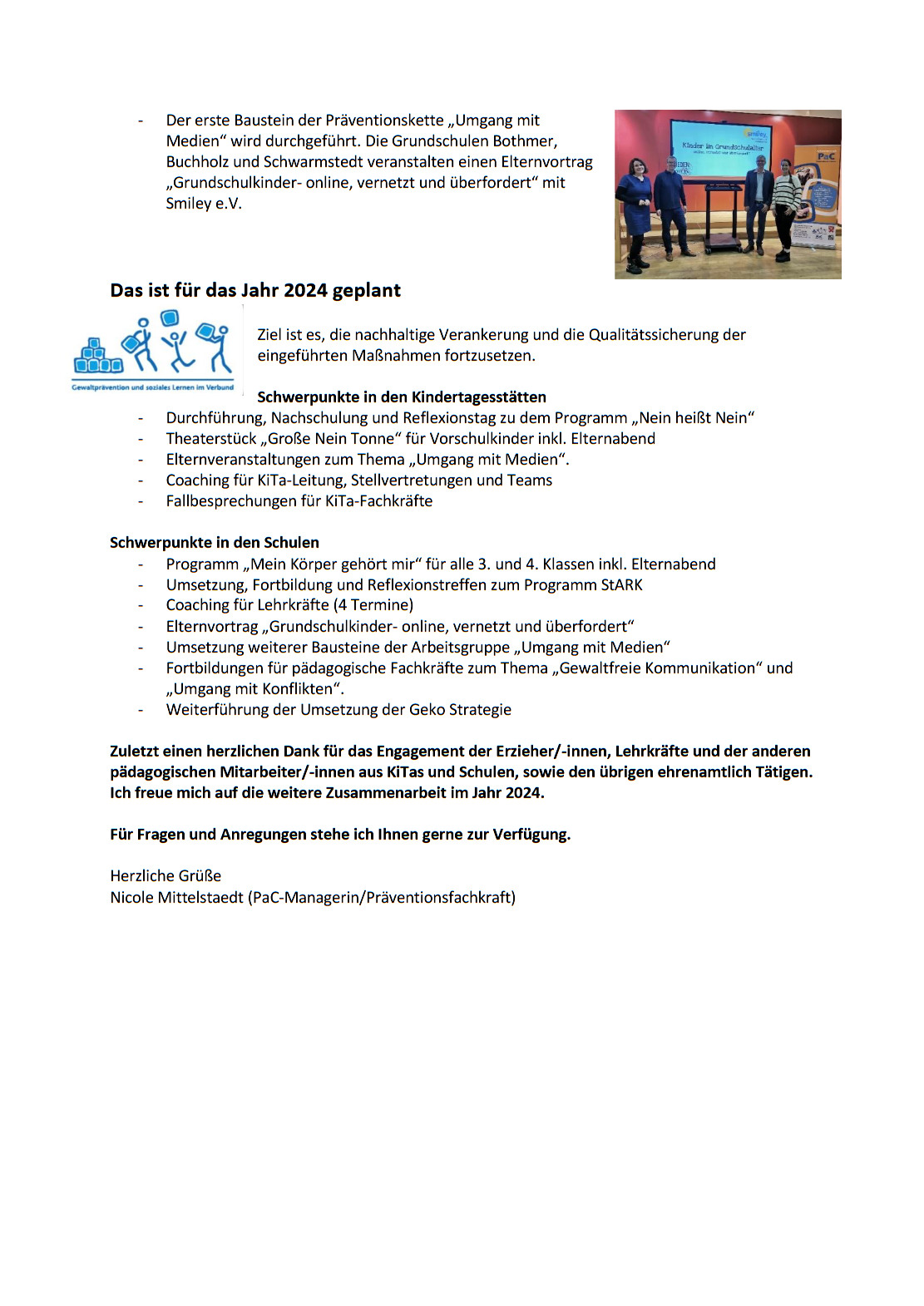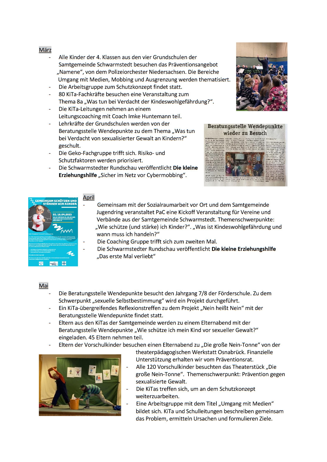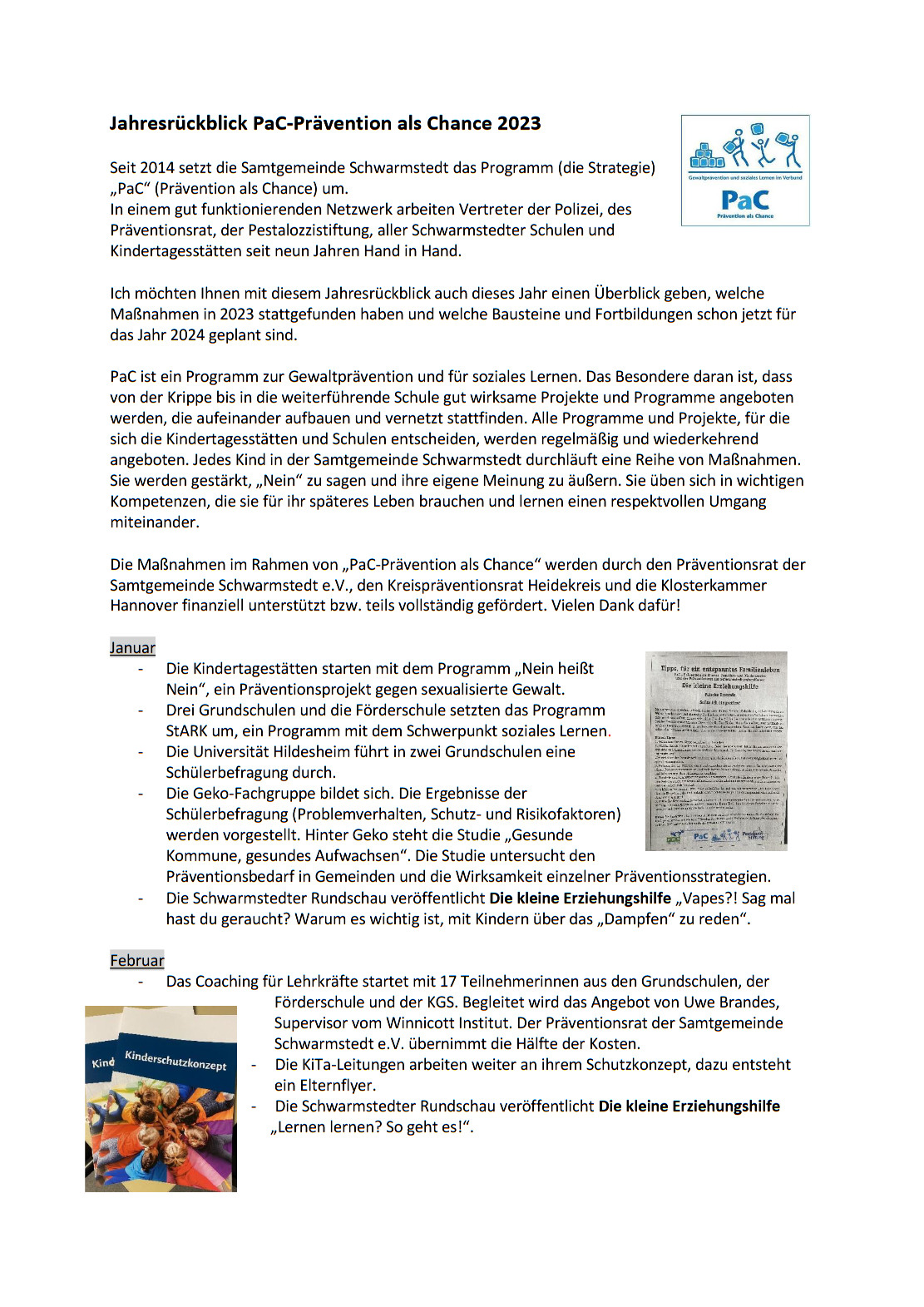 Seit 2014 setzt die Samtgemeinde Schwarmstedt das Programm (die Strategie) „PaC“ (Prävention als Chance) um. In einem gut funktionierenden Netzwerk arbeiten Vertreter der Polizei, des Präventionsrat, der Pestalozzistiftung, aller Schwarmstedter Schulen und Kindertagesstätten seit neun Jahren Hand in Hand.