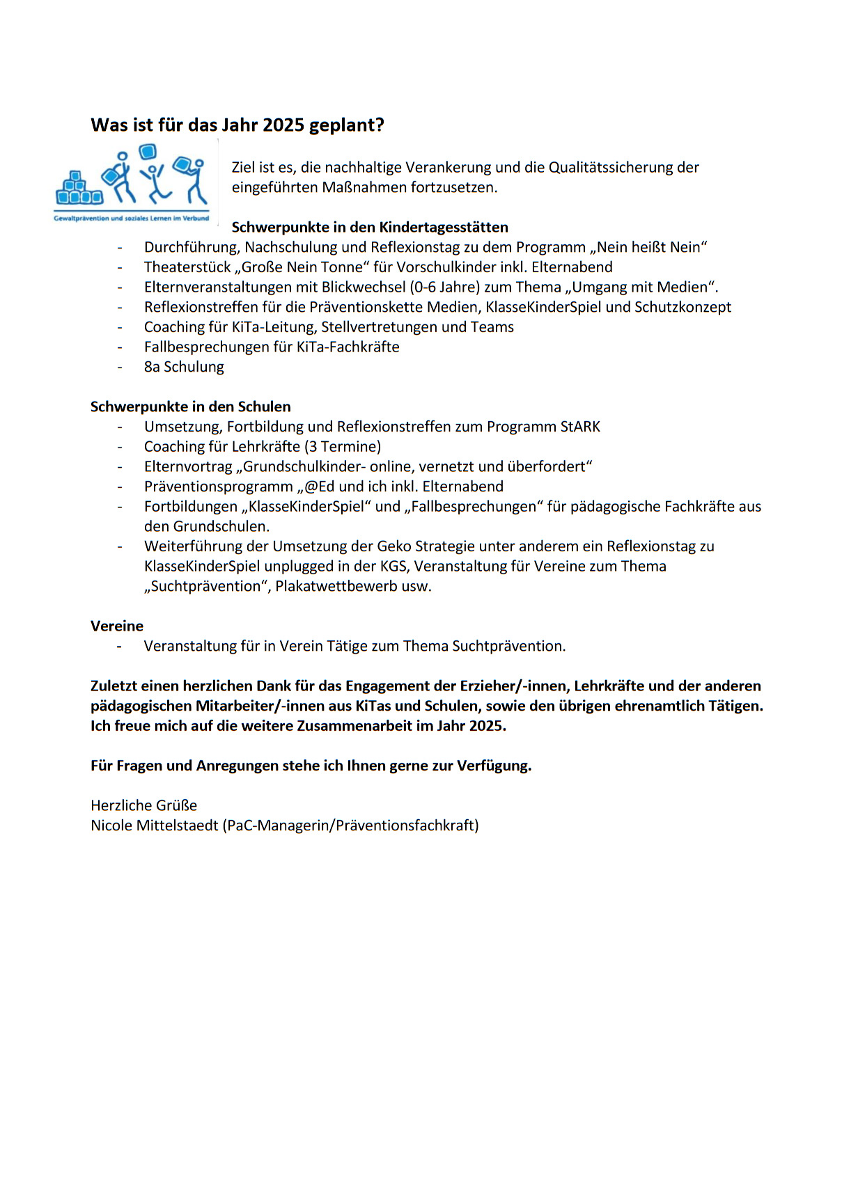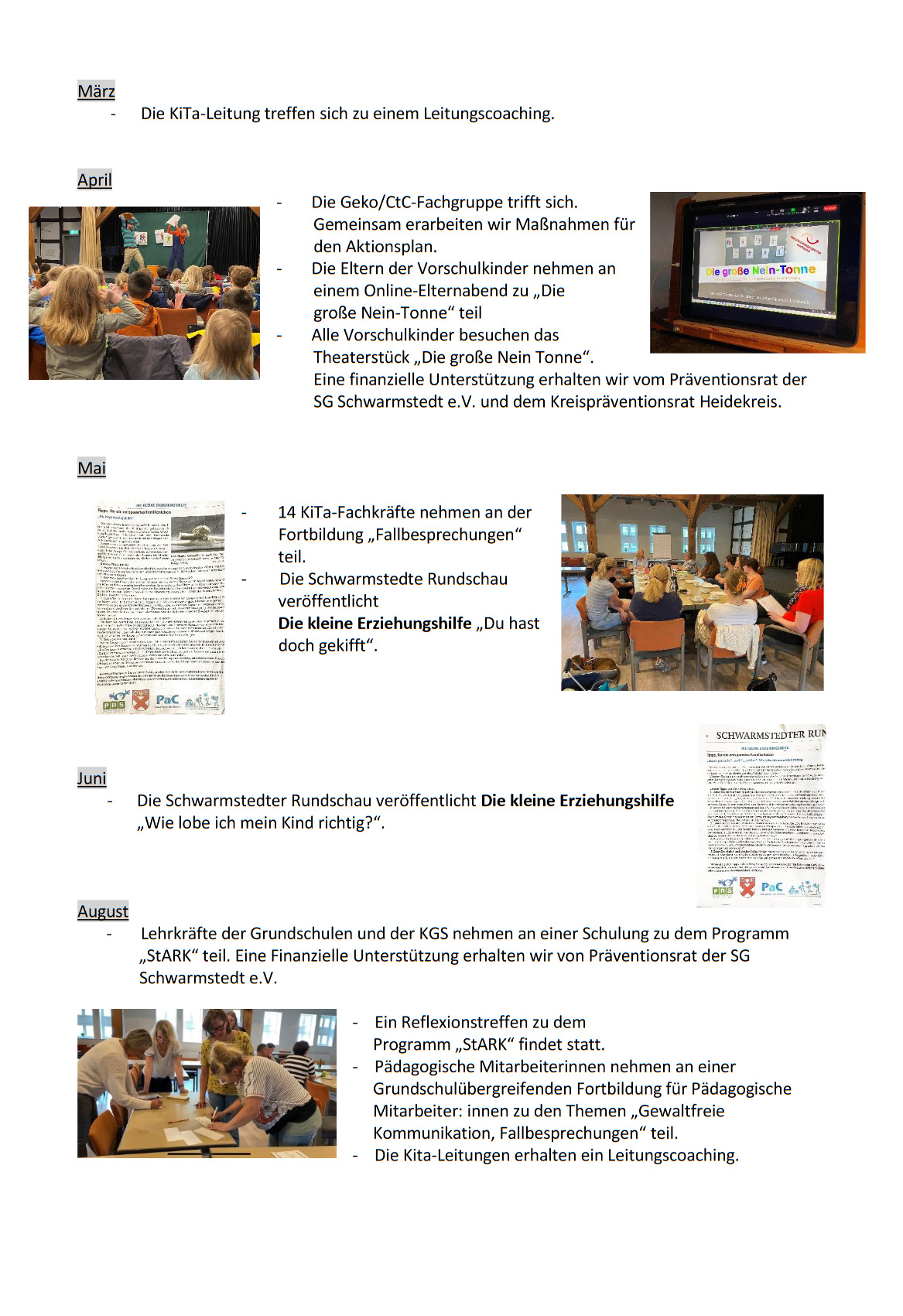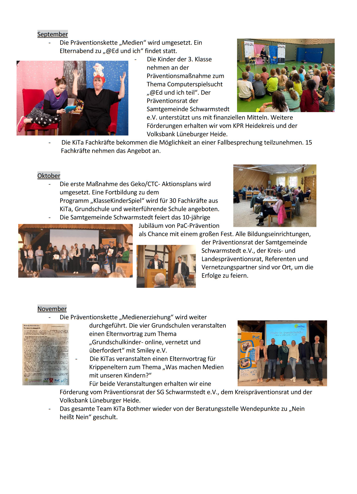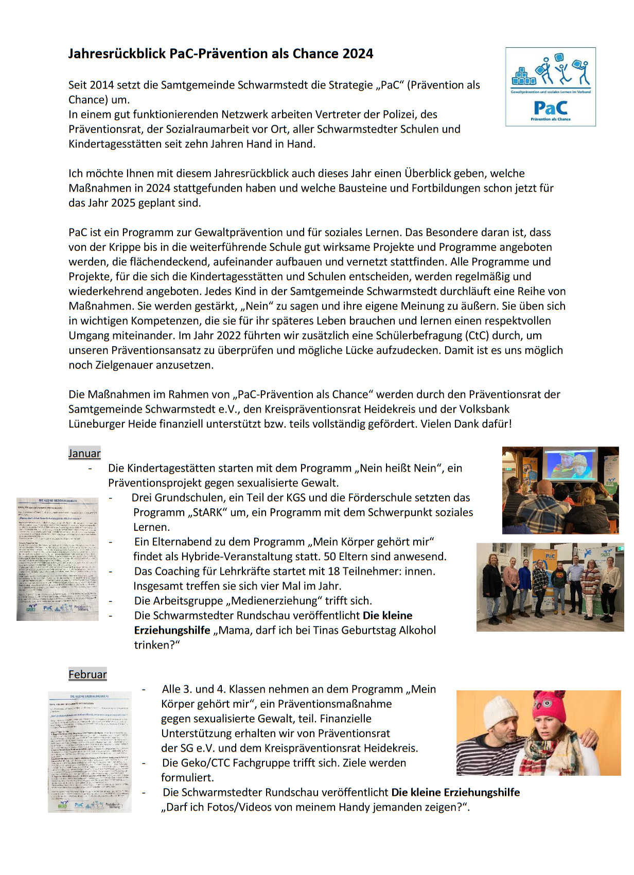 Seit 2014 setzt die Samtgemeinde Schwarmstedt das Programm (die Strategie) „PaC“ (Prävention als Chance) um. In einem gut funktionierenden Netzwerk arbeiten Vertreter der Polizei, des Präventionsrat, der Pestalozzistiftung, aller Schwarmstedter Schulen und Kindertagesstätten seit zehn Jahren Hand in Hand.