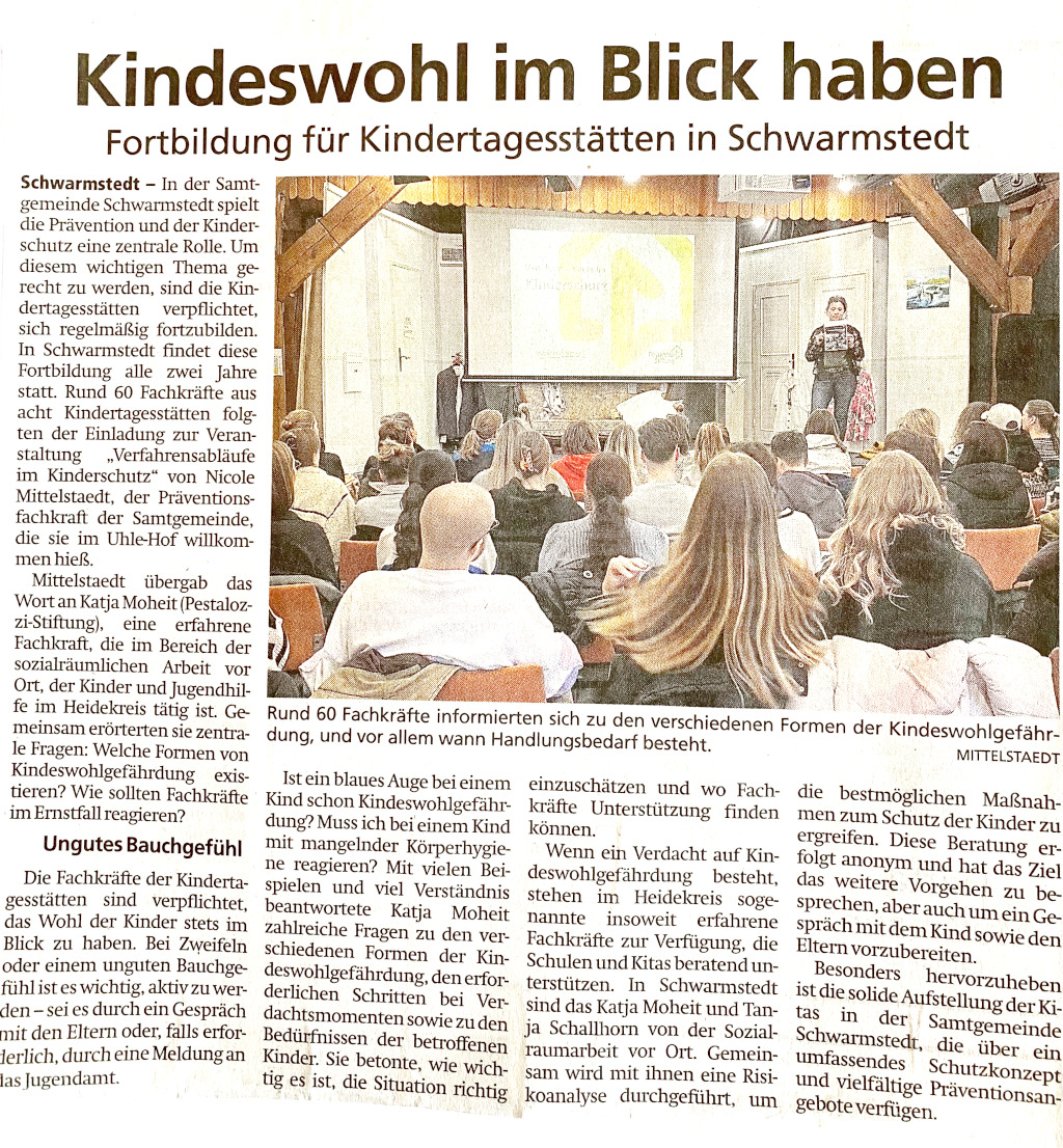 Wenn sich ein Verdacht auf Kindeswohlgefährdung bestätigt, stehen im Heidekreis sogenannte insoweit erfahrene Fachkräfte zur Verfügung, die Schulen und Kitas beratend unterstützen. In Schwarmstedt sind das Katja Moheit und Tanja Schallhorn von der Sozialraumarbeit vor Ort. Gemeinsam wird mit ihnen eine Risikoanalyse durchgeführt, um die bestmöglichen Maßnahmen zum Schutz der Kinder zu ergreifen. Diese Beratung erfolgt anonym und hat das Ziel das weitere Vorgehen zu besprechen, aber auch um ein Gespräch mit dem Kind sowie den Eltern vorzubereiten.