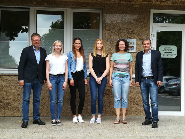 Zum Foto: Die neuen Auszubildenden wurden an ihrem ersten Arbeitstag von Samtgemeindebürgermeister Björn Gehrs,