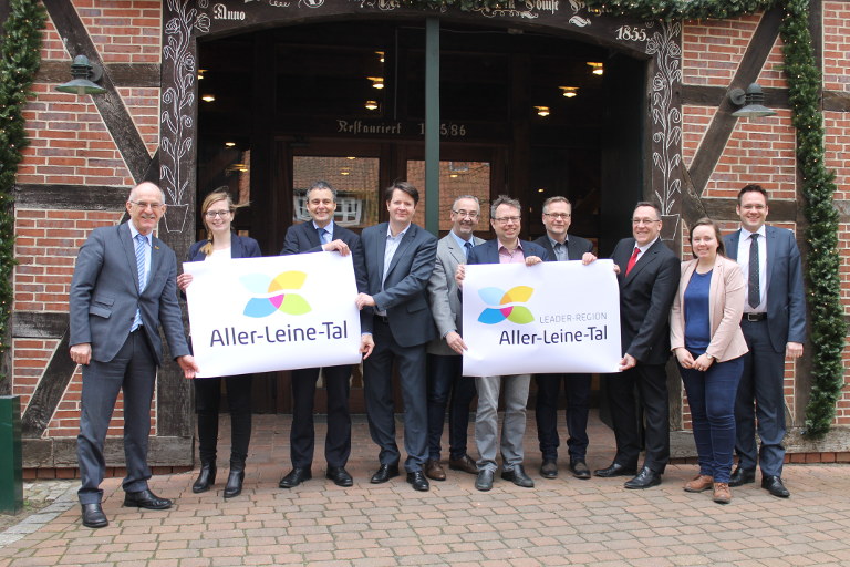 Stolz präsentieren (von links nach rechts) Wolfgang Rodewald (Bürgermeister Gemeinde Kirchlinteln), Johanna Michelmann (Leiterin der Tourismusregion beim Zweckverband Aller-Leine-Tal), Cort-Brün Voige (Samtgemeindebürgermeister Samtgemeinde Rethem/Aller), Carsten Niemann (Samtgemeindebürgermeister Samtgemeinde Ahlden), Thomas Herbst (Bürgermeister Gemeinde Hambühren), Björn Gehrs (Samtgemeindebürgermeister Samtgemeinde Schwarmstedt und Geschäftsführer des Zweckverbands Aller-Leine-Tal), Frank Meinecke (allg. Vertreter des Bürgermeisters Gemeinde Wietze), Dirk Oelmann (Bürgermeister Gemeinde Winsen/Aller), Jeanett Kirsch (Regionalmanagerin der LEADER-Region) und Alexander von Seggern (Bürgermeister Gemeinde Dörverden) das neue Logo für den Zweckverband und die LEADER-Region Aller-Leine-Tal.
