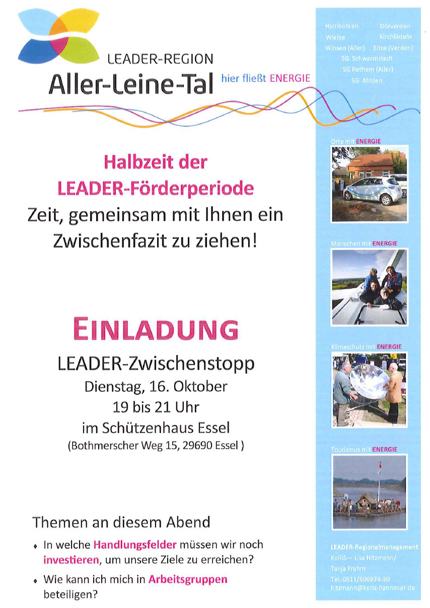 Einladung LEADER-Zwischenstopp am 16.10.2018 um 19 Uhr im Schützenhaus Essel