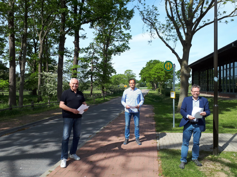 Zum Foto: Letzte Abstimmung vor Ort: Voraussichtlich Ende Mai starten die Ausbaumaßnahmen „Speckendamm“ in Lindwedel. V.L. Bürgermeister Artur Minke, Diplom Ingenieur Oliver Bärthel und Samtgemeindebürgermeister Björn Gehrs.