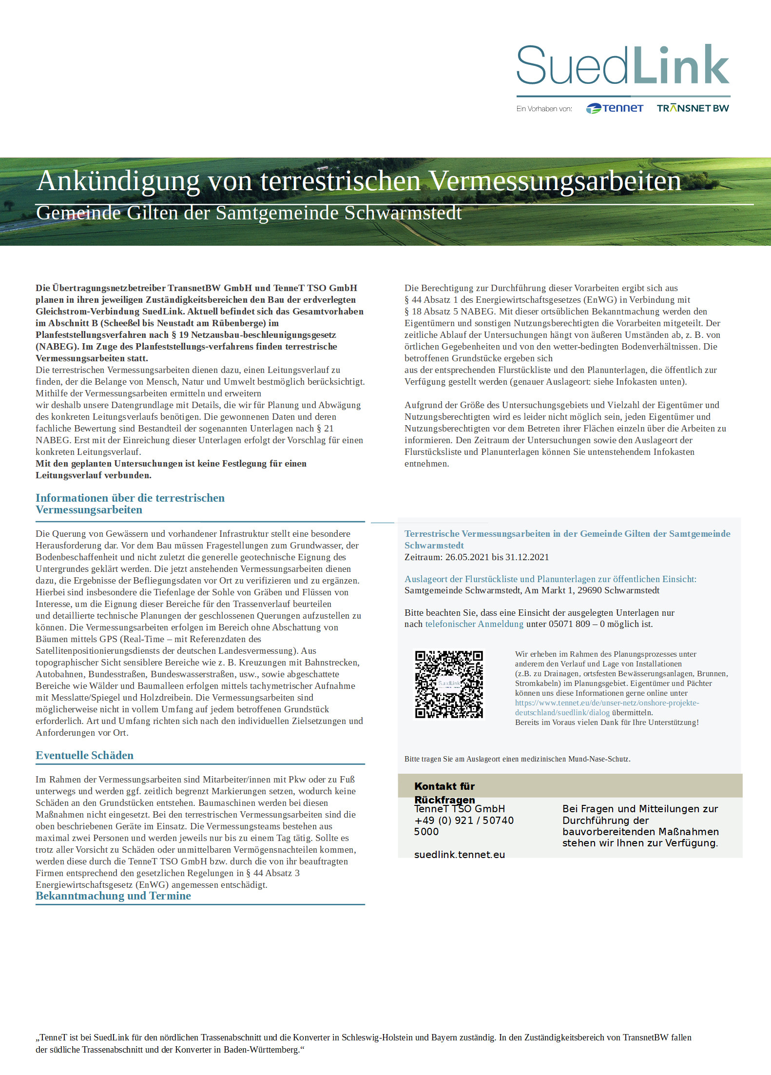 SuedLink - Ankündigung von Kartierungsarbeiten in den Gemeinden Buchholz (Aller), Gilten, Lindwedel der Samtgemeinde Schwarmstedt