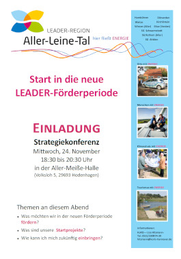 Die Menschen aus dem Aller-Leine-Tal wissen am besten, was ihre Region ausmacht und woran es in ihrer Heimat fehlt. Daher hat die Europäische Union einen „Bottom Up“ Ansatz entwickelt – LEADER. LEADER ist ein Förderansatz der Europäischen Union, der es Menschen in ländlichen Gebieten ermöglicht, die regionalen Prozesse vor Ort mitzugestalten. Wörtlich verbirgt sich hin-ter der Abkürzung LEADER "Liaison Entre Actions de Développement de l'Économie Rurale" und bedeutet übersetzt "Verbindung zwischen Aktionen zur Entwicklung der ländlichen Wirtschaft".