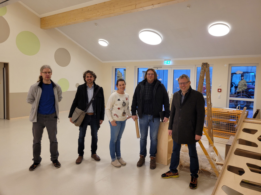 Zum Foto: Bauabnahme bestanden. Ab Januar geht es los. (v.r.)  Björn Gehrs (Gemeindedirektor), Frank May (Bauamt), Karina Passarge (Kita-Leitung), Robert Szalay (Architekt), Oliver Beesch (Fachbereichsleiter technische Dienste)
