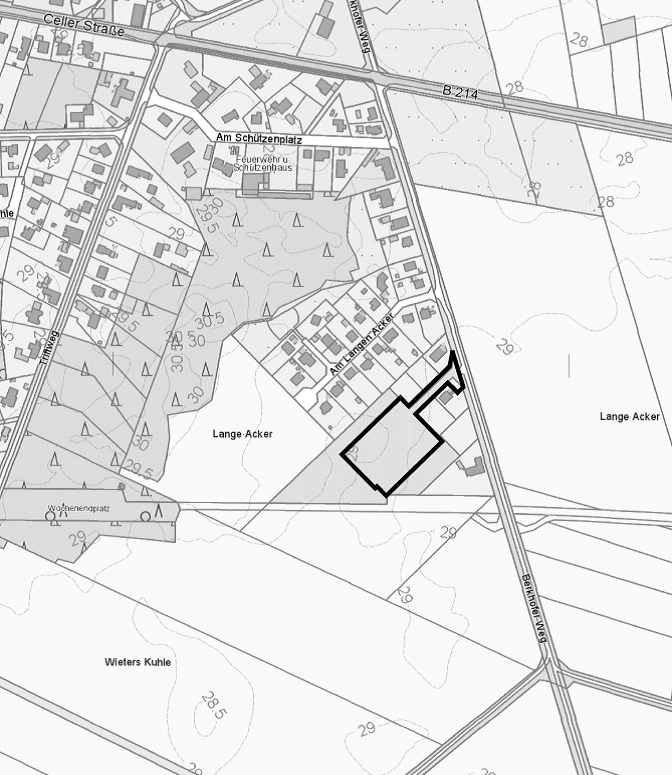 Der räumliche Geltungsbereich der 1. Änderung des Bebauungsplans Nr. 20 „Berkhofer Weg II“ liegt im Ortsteil Marklendorf südlich der B 214 und östlich der Straße Berkhofer Weg im Anschluss an das Baugebiet „Am Langen Acker“. Die Grenze des räumlichen Geltungsbereichs ist im folgenden Kartenausschnitt verdeutlicht: