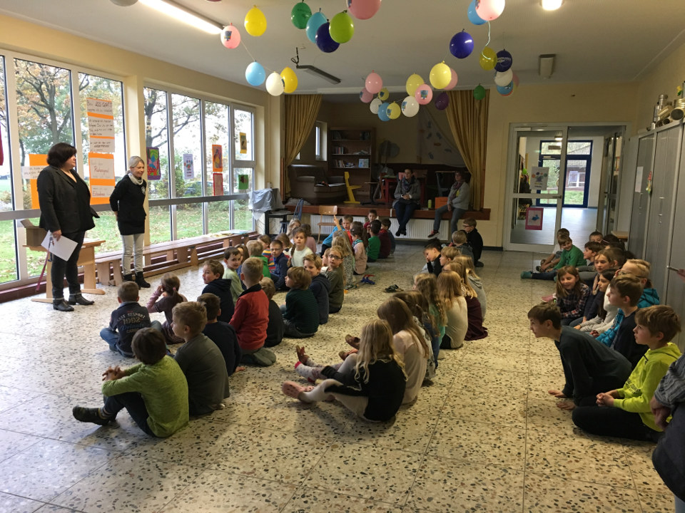 Die Kinder applaudierten begeistert, als die Lehrerinnen den Kindern das Belohnungssystem vorstellten. Zukünftig können sich die Kinder Joker erarbeiten. Positives Verhalten wird dadurch gestärkt und gleichzeitig bekommen die Kinder ein Verständnis davon, was es bedeutet, zu sparen. Für einen Joker können sie nämlich z.B. eine Schulstunde ein Cap im Unterricht tragen, mit 6 Jokern die Sportstunde bestimmen und 10 Joker brauchen sie, um mit Frau Schudt auf eine Radtour oder mit Frau Kassens eine Fahrt ins Schwimmbad zu unternehmen.