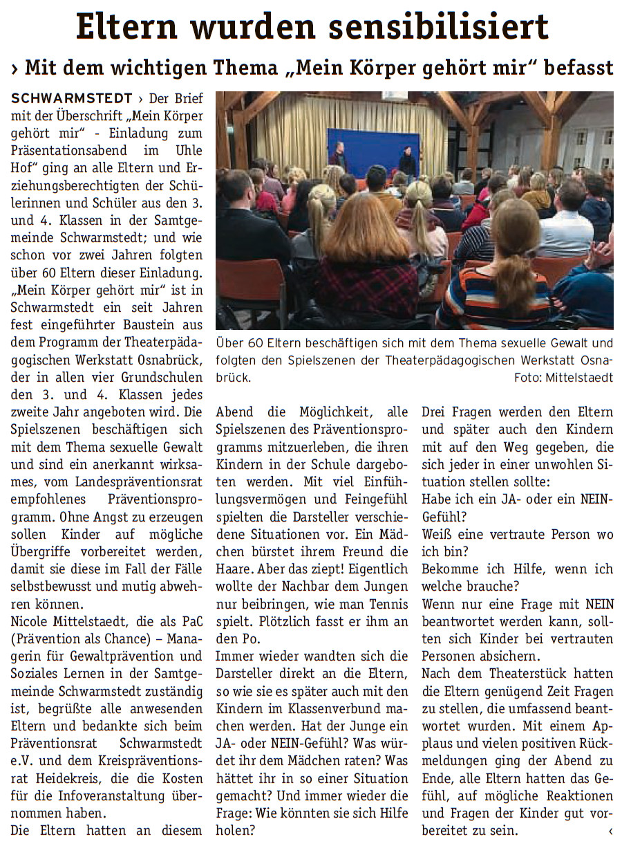 Der Brief mit der Überschrift „Mein Körper gehört mir“ - Einladung zum Präsentationsabend im Uhle Hof“ ging an alle Eltern und Erziehungsberechtigten der Schülerinnen und Schüler aus den 3. und 4. Klassen in der Samtgemeinde Schwarmstedt