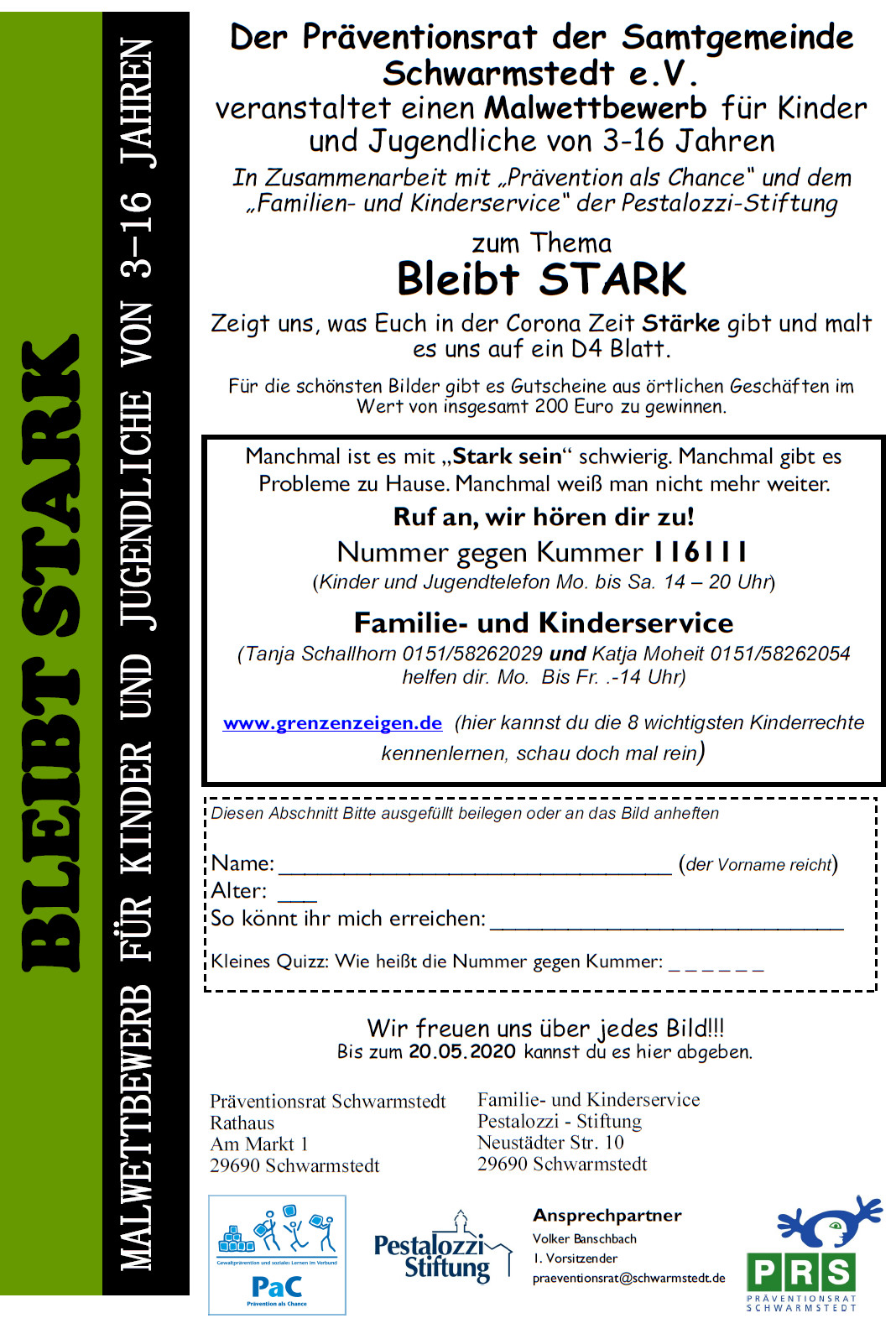 Der Präventionsrat der Samtgemeinde Schwarmstedt e.V. veranstaltet einen Malwettbewerb für Kinder und Jugendliche von 3-16 Jahren In Zusammenarbeit mit „Prävention als Chance“ und dem „Familien- und Kinderservice“ der Pestalozzi-Stiftung zum Thema Bleibt STARK