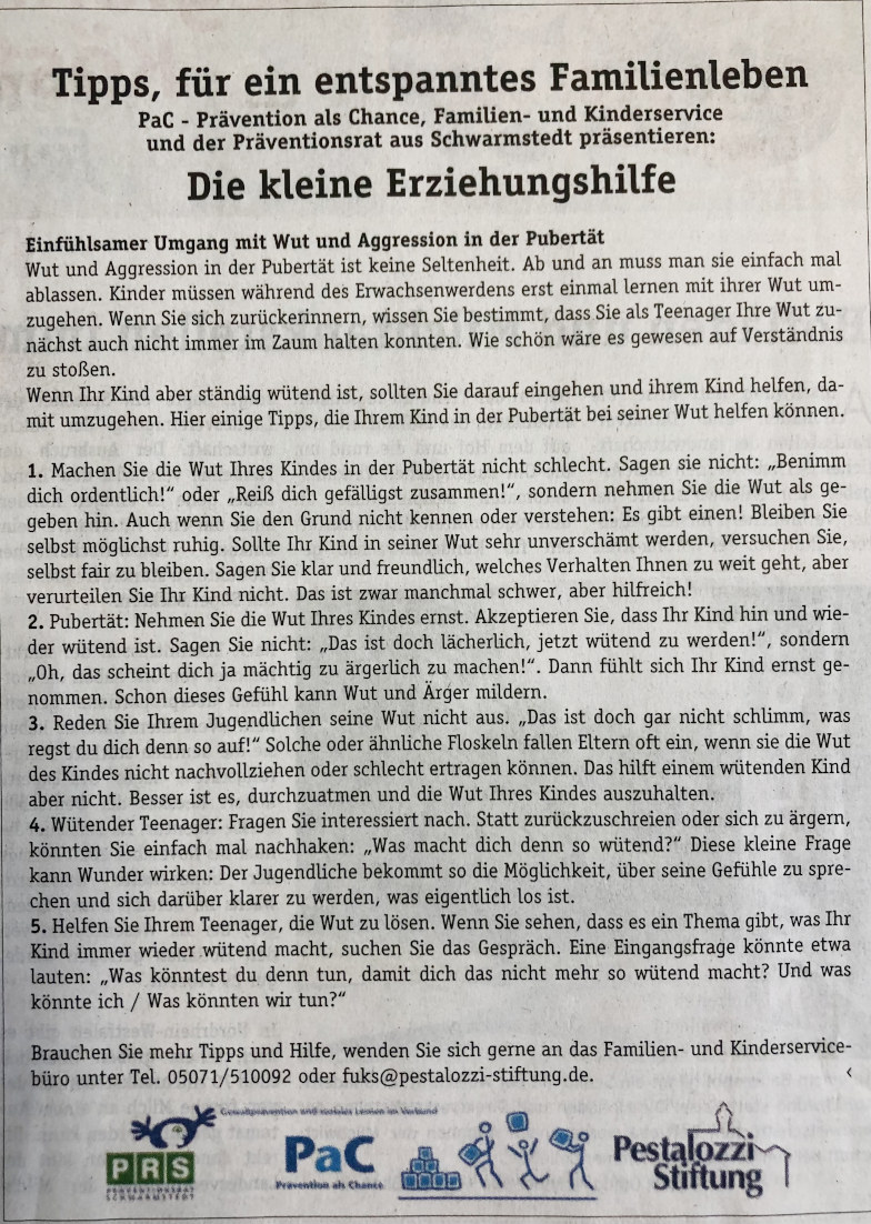 PaC - Prävention als Chance, Familien- und Kinderservice und der Präventionsrat aus Schwarmstedt präsentieren: Die kleine Erziehungshilfe. Artikel aus der Schwarmstedter Rundschau vom 08.05.2021