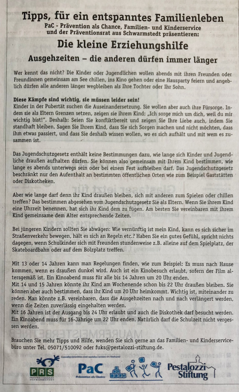 PaC - Prävention als Chance, Familien- und Kinderservice und der Präventionsrat aus Schwarmstedt präsentieren: Die kleine Erziehungshilfe. Artikel aus der Schwarmstedter Rundschau vom 19.06.2021