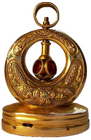 Berlocke - Es handelt sich um ein Schmuckobjekt mit Musikwerk , sogen. "Bijou de Geneve" / Berlocke um 1810 d.h. eine der ältesten Spieluhren, Musikwerk mit 9 gestapelten Tönen, Bestiftung auf dem Federgehäuse (musique a barillet) Gehääuse aus Gold mit Emailverzierung und Gravuren, Aufzugschaft mit vier Rubinen besetzt.